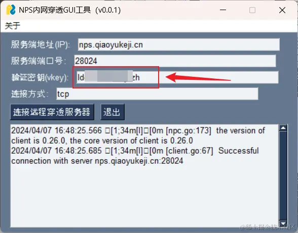 填寫好自己的 nps 服務端的 網址(IP)、端口、驗證密鑰(vkey)與連接方式,點擊連接顯示連接成功。
