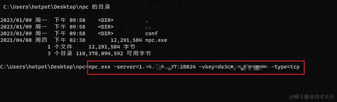command = f"npc.exe -server={address}:{port} -vkey={vkey} -type={type}"