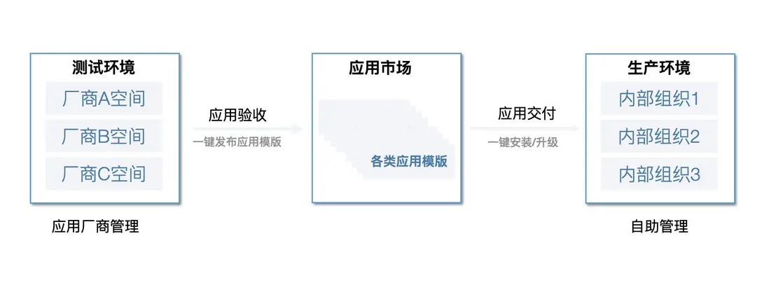 Rainbond的供應商交付管理解決方案,為企業與供應商的協作提供了“尚方寶劍”。它能為每個供應商提供獨立的、安全的、資源可控的測試環境,互不干擾。更核心的是,供應商在Rainbond中測試通過的軟件,可以一鍵發佈為標準的“應用模版”。企業信息化部門在生產環境中,可以直接基於此模版一鍵安裝部署,省時省力。當供應商有新版本或Bug修復時,只需在測試環境驗證通過後更新應用模版,生產環境即可實現業務不中斷的一鍵升級。整個交付、測試、上線、升級的每一步都清晰可追溯,讓企業“管理更安心”,真正掌控與供應商的協作全局。