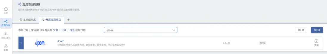 進入 Rainbond 控制枱的 平台管理 -> 應用市場 -> 開源應用商店 中搜索 Jpom 並安裝。