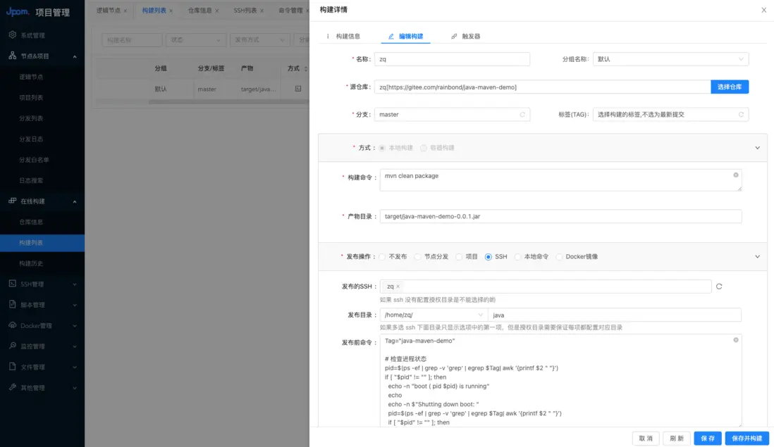 簡述使用 Jpom 構建 Java 項目然後通過 SSH 發佈到服務器上並運行。