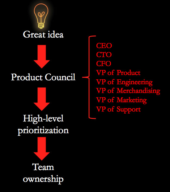 When there is no clear development process, “prioritization” can end up being a complex algorithm consisting of the last email request sent, the job title of the requestor, and proximity to the development team. This is no way to build a product. One way to address the difficulties of prioritization is through the concept of a “product council.”