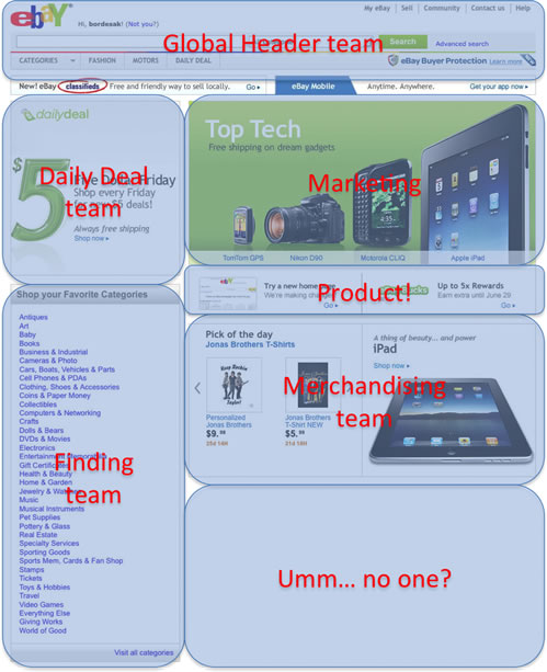 Don’t believe me? Below is an example of the eBay home page from about a year ago, with the teams responsible for each section of the page overlaid (they’ve since gone through a redesign that fixed this issue):
