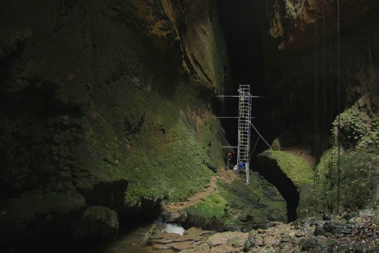 A 15-meter-high motion-control rig was built, with a vertical dolly track that housed a Canon 5D DSLR. The rig was set up at each location, and the camera travelled 12 meters down it, taking anywhere between 750 and 950 stills, a process that lasted at least two hours each time (and six hours at Milford Sound, the first location on the website), because the camera moved around 15 millimeters every 10 seconds.