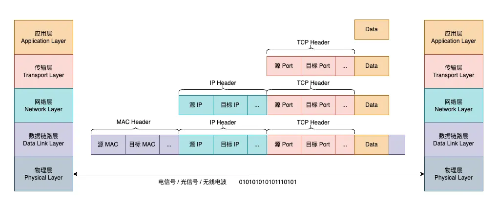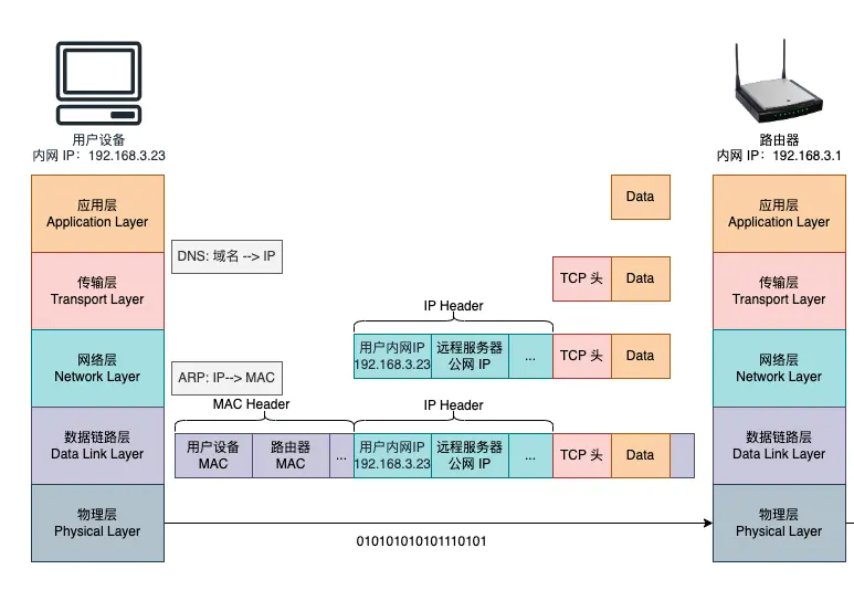 ARP協議查找目標 MAC 地址(此時得到路由器的 MAC 地址)。在數據鏈路層則封裝了 MAC 頭部,其中包含了源 MAC(用户設備 MAC)地址和目標 MAC(路由器 MAC)地址。 - 最後,數據在物理層通過無線電波(WiFi)傳遞二進制數據到路由器(如果是雙絞線則是電信號,光纖則是光信號)。路由器接收到數據後,進入下一階段處理。