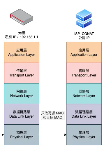 光貓負責將數據通過一系列中間網絡設備,最終傳遞到 ISP 的 NAT 設備。