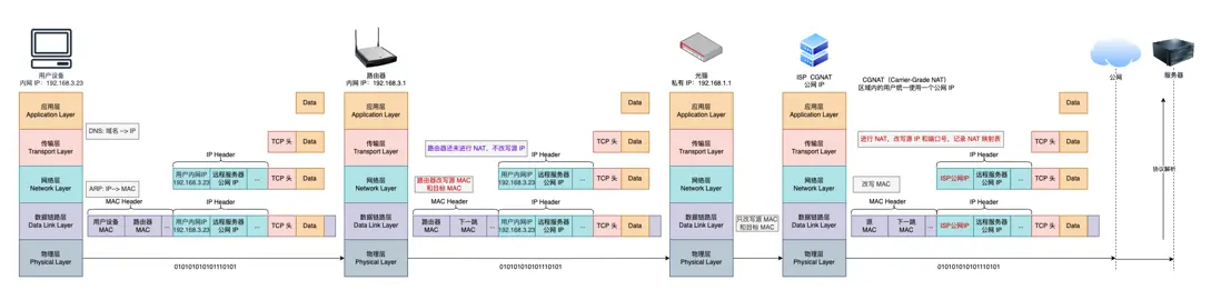 - 網絡層:封裝 IP 頭,包含源 IP(用户設備的內網 IP)和目標 IP(遠程服務器公網 IP)地址。