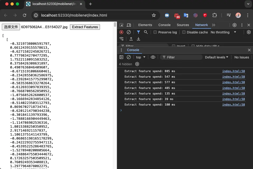 以下給出一個前端使用 mobilenet 完成圖像特徵提取的示例: