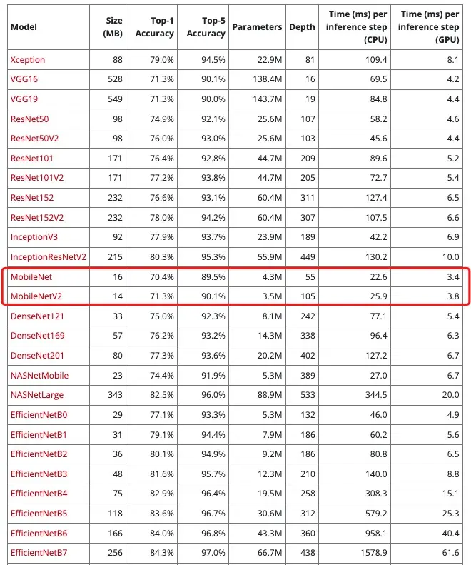 我們根據上圖中的模型對比可以看到 mobilenet 這種模型更符合我們的需求(模型的名字就能看出來)。