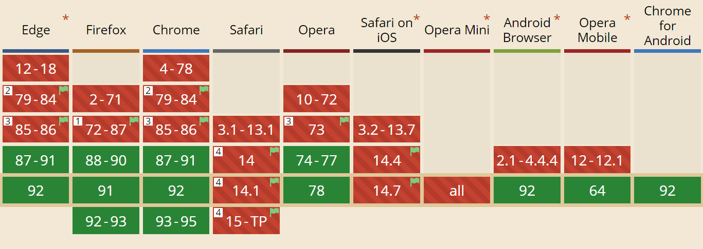 - Apple Safari (version 14): Behind a manual flag. Will be enabled by default in version 15, which is currently in technology preview.