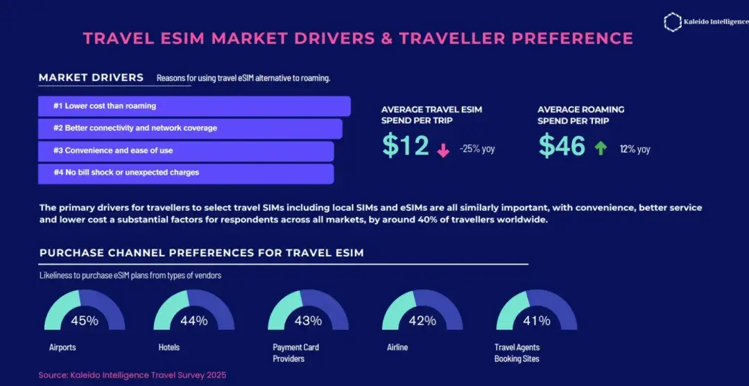- 旅行場景驅動核心增長: GSMA 調查顯示,51% 的 eSIM 用户將其用於旅行。Airalo 等第三方 eSIM 服務商通過旅行場景實現用户量激增,其中 85% 的 Airalo 用户是首次體驗 eSIM。eSIM 的便利性和安全性(硬件綁定安全元素)是主要優勢。