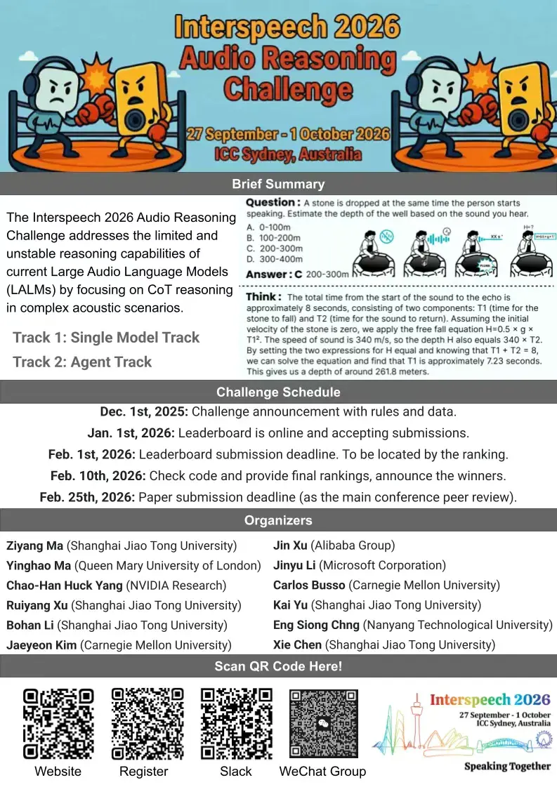 由來自上海交通大學、南洋理工大學、倫敦瑪麗女王大學、卡內基梅隆大學、英偉達、阿里巴巴、微軟的研究者們聯合舉辦的 Interspeech 2026 音頻推理挑戰賽現已開啓!本次挑戰賽旨在解決當前大型音頻語言模型(LALM)推理能力有限且不穩定的問題,聚焦於複雜聲學場景下的思維鏈(CoT)推理能力。挑戰賽設有以下兩個賽道: