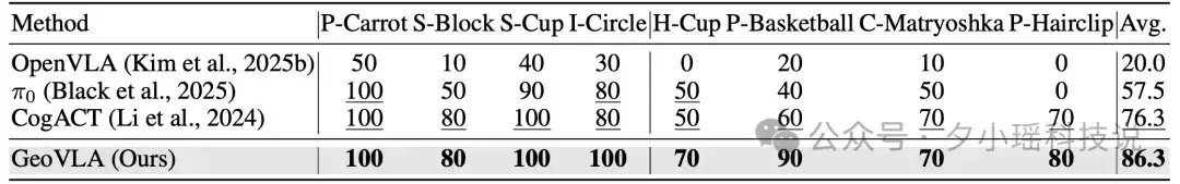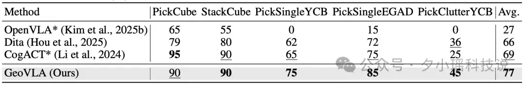 GeoVLA 在仿真和真機實驗中均展現出對傳統 2D VLA 模型的壓倒性優勢,證明顯式 3D 表徵在複雜操作中的不可替代性。