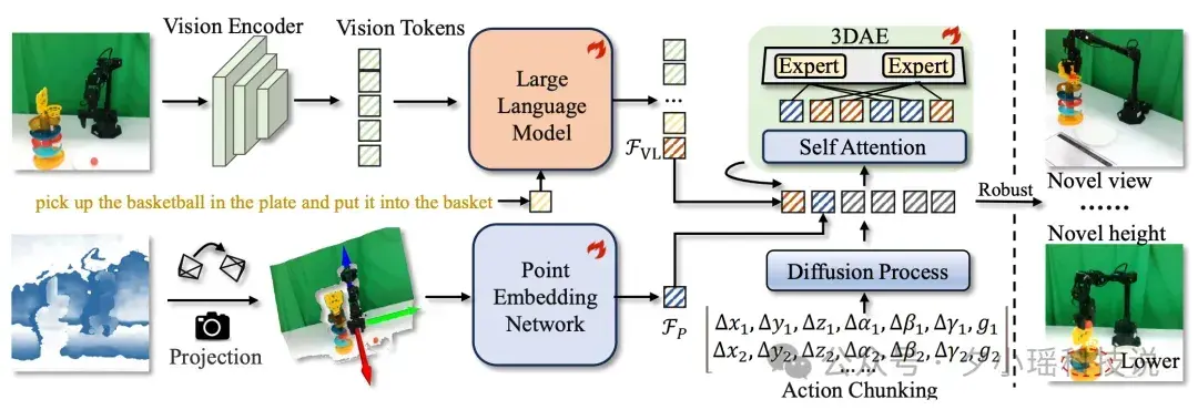 GeoVLA 是一個全新的端到端框架,其流程包含三個關鍵組件的協同工作: