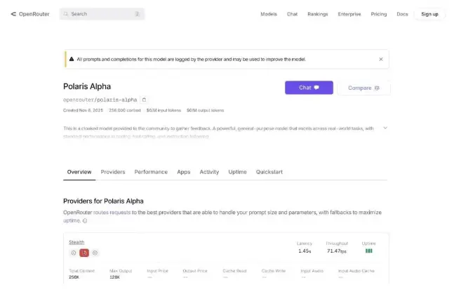 OpenRouter 平台在 11 月 7 日深夜上線了一款全新隱名模型「Polaris Alpha」,被業內普遍認為是 GPT 5.1 的測試版本。
