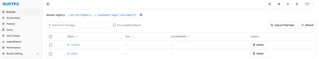 可以看到容器鏡像 localhost:5000/rustfs:1.0.0-alpha.77 的相關數據已經存儲到 RustFS 中了。