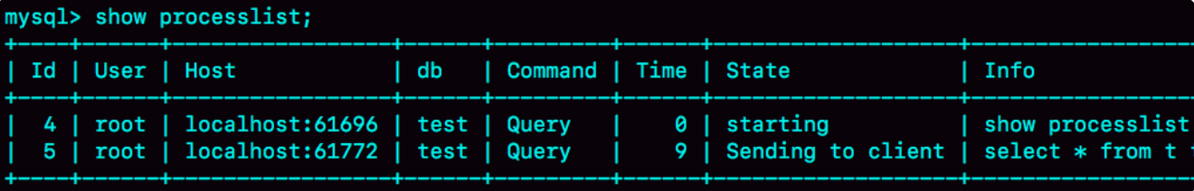 即MySQL是邊讀邊發的,如果客户端接收慢,會導致MySQL發不出去,事務的執行時間變長。此時如果使用show processlist命令: