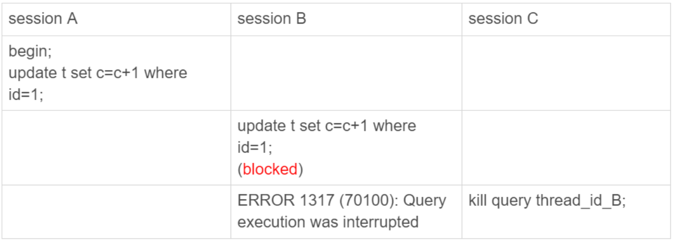 將session B的運行狀態改成THD::KILL_QUERY(將變量killed賦值為THD::KILL_QUERY);
