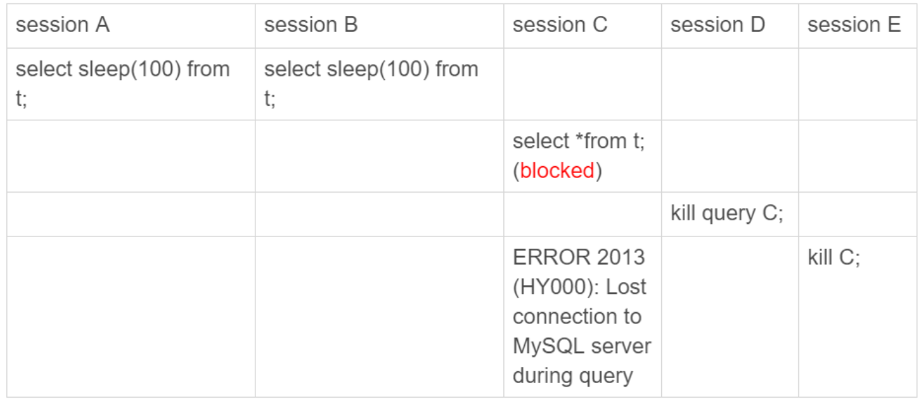 接下來看一個kill不掉的例子。首先執行set global innodb_thread_concurrency=2,將InnoDB併發線程上限數設置為2,然後執行下面的序列: