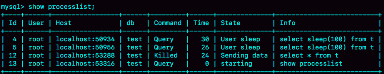 有時候可能會遇到:使用了kill,卻沒能斷開該連接,再執行show processlist時,看到這條語句的command列顯示的是killed。