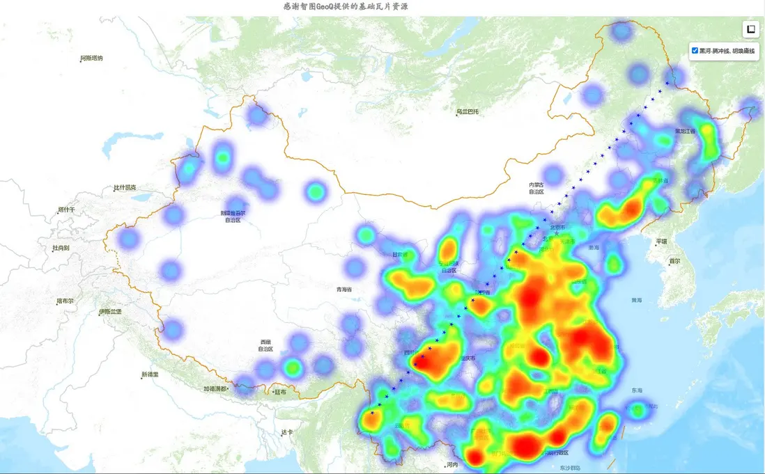 地圖.添加網頁標題(網頁標題樣式類(標題文本='感謝智圖GeoQ提供的基礎瓦片資源', 文本字體='楷體', 文本顏色=顏色名.灰))