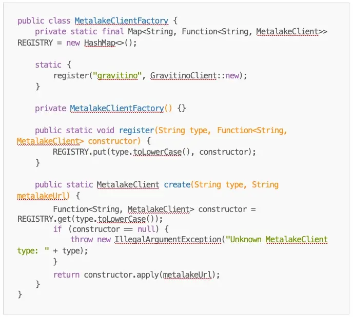 - 使用工廠方法,根據metalakeType選擇合適的client。