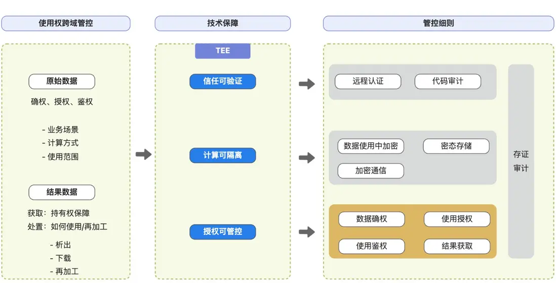 如何保障使用權跨域管控是數據要素流通中的挑戰,這既需要法規授權作為基礎,也需要有效的技術進行保障。通過依法授權獲得數據使用權限,通過技術保障數據不被泄露和濫用。