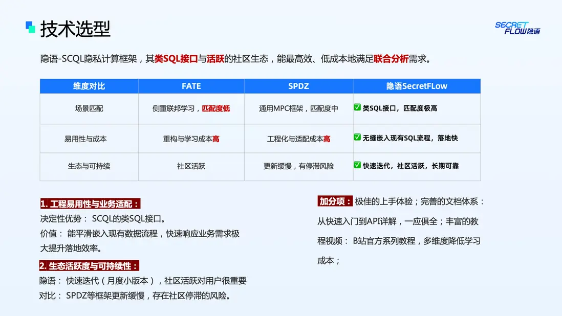 相較而言,隱語(Secretflow)在我們關心的幾個方面都展現出了明顯優勢。