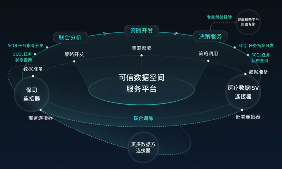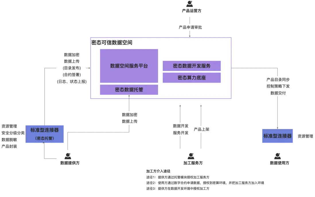 數據提供方、加工服務方、產品運營方、數據使用方等多方,通過密態可信數據空間完成數據託管、數據加工、產品上架、數據申請流程。