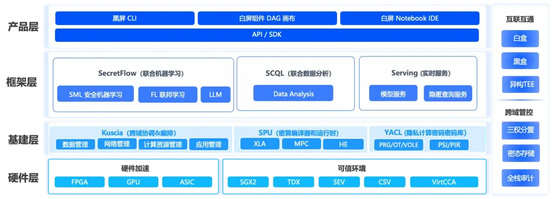 提供包括聯合數據分析(SCQL)、隱私求交(PSI)、隱匿查詢(PIR)、聯合建模(MPC/FL)等多種查詢分析能力。