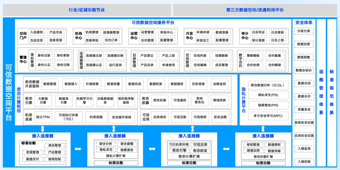 - 可信數據空間服務平台,包括空間服務門户和管理中心。空間服務門户是面向數據空間的各參與方提供業務應用入口,包括空間門户、機構中心、運營中心、開發中心、審計中心等。管理中心實現了身份管理、連接器管理、目錄管理、數字合約管理、數據空間管理等功能。並支持按照“三統一”要求,保持身份、標識、目錄與區域/行業功能節點的互聯互通。
