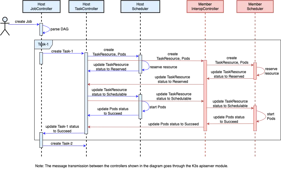 - 任務參與方的 InterConn Controller 從調度方集羣中將本方的 TaskResource 和 PodGroup 同步到參與方集羣中。參與方集羣中的 TaskResource 和 PodGroup 的狀態也會通過
