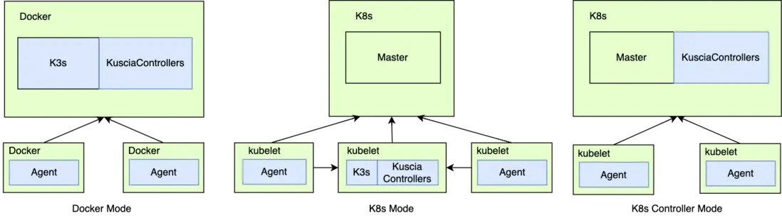 Kuscia 提供三種部署模式:Docker 模式、K8s 模式、K8s 控制器模式,以適配不同機構的基礎設施。
