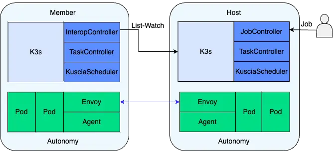 - Kuscia Scheduler: Kuscia 調度器,負責多方 Pod 的 Co-Scheduling 調度,具備 All-or-Nothing 調度效果。