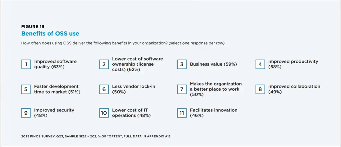 《報告》顯示,開源的價值已超越單純的成本節約:63%提升軟件質量,59%創造商業價值,58%提升生產力,51%縮短上市時間,50%減少供應商鎖定。