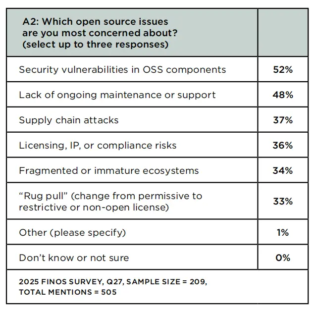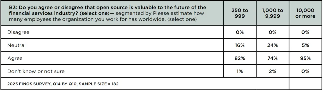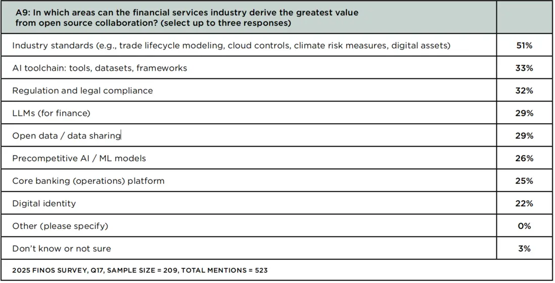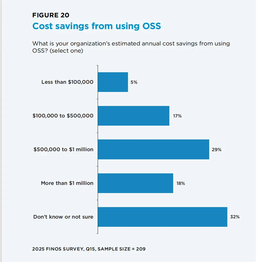 但價值量化仍面臨挑戰:32%的受訪者不確定開源帶來的年度成本節約,45% 的大型機構表示“無法準確量化”。這一問題導致部分金融機構對開源的投入仍持謹慎態度,難以形成持續的資源支持。