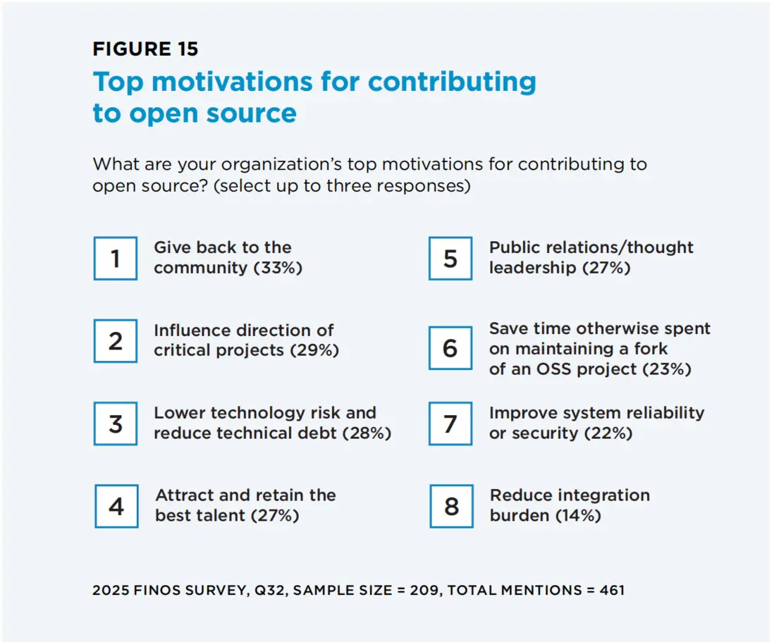 貢獻動機呈現“戰略化特徵”:33%為“回饋社區”,29%為“影響關鍵項目方向”,28%為“降低技術債務”,27%為“吸引和保留人才”。這意味着金融機構已從開源生態的受益者轉變為建設者,通過貢獻代碼、參與治理,將業務需求與技術實踐融入開源項目,提升行業整體技術底座質量。