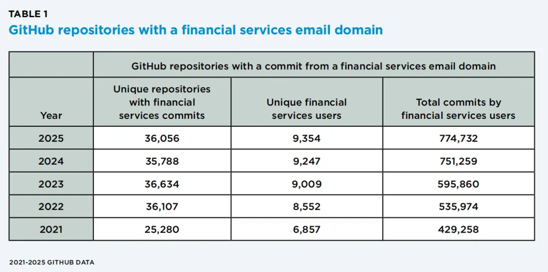 《報告》追蹤2021-2025年GitHub數據發現,金融行業開源貢獻持續增長:2025年有9,354名金融機構員工向36,056個開源倉庫提交了774,732次代碼提交,較2021年分別增長36.4%、42.6%和80.5%。