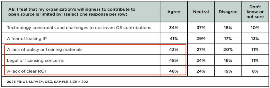從實踐來看,OSPO的核心價值在於整合開源決策、合規審查、風險管控與社區協作,解決了此前開源使用部門化割裂、政策不統一的痛點。《報告》提到,部分機構仍存在政策執行不一致的問題,48%的受訪者認為“缺乏清晰ROI”和“法律/許可顧慮”是阻礙開源貢獻的首要因素,43%的機構缺乏開源相關政策或培訓材料。這一痛點在中小金融機構中尤為突出,由於缺乏專業治理團隊,開源使用往往陷入“重使用、輕管控”的困境,可能引發許可證合規風險、漏洞傳導風險等問題。