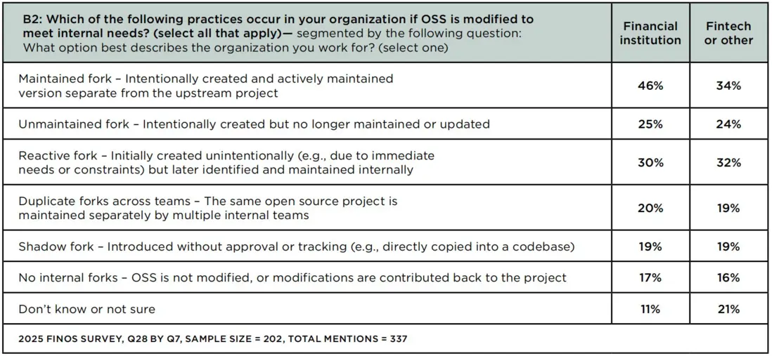 但《報告》也指出,貢獻實踐仍存在碎片化問題:20%的機構存在“跨團隊重複維護同一開源項目分支”的情況,19%存在“未授權或未追蹤的影子分支”,46%的金融機構存在“有意維護的獨立分支”,這些行為會導致技術債增加、維護成本上升、安全風險累積。