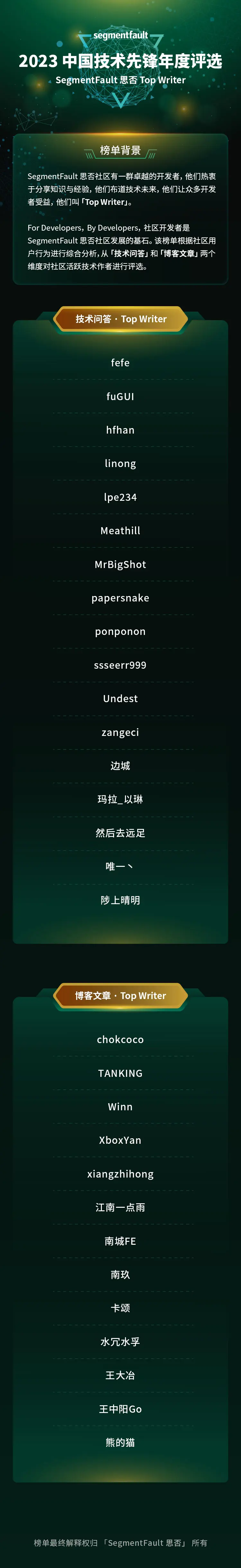 為了感謝 2023 年對社區做出卓越貢獻的開發者們,我們基於用户行為大數據(如文章發佈數量、參與回答數量、點贊量等)的綜合分析,從「技術問答」和「博客文章」兩個維度共評選出 30 位創作者給予「SegmentFault 思否 2023 年度 Top Writer」稱號。他們的出色表現,贏得了社區的尊重和讚譽,讓我們為他們喝彩!他們是: