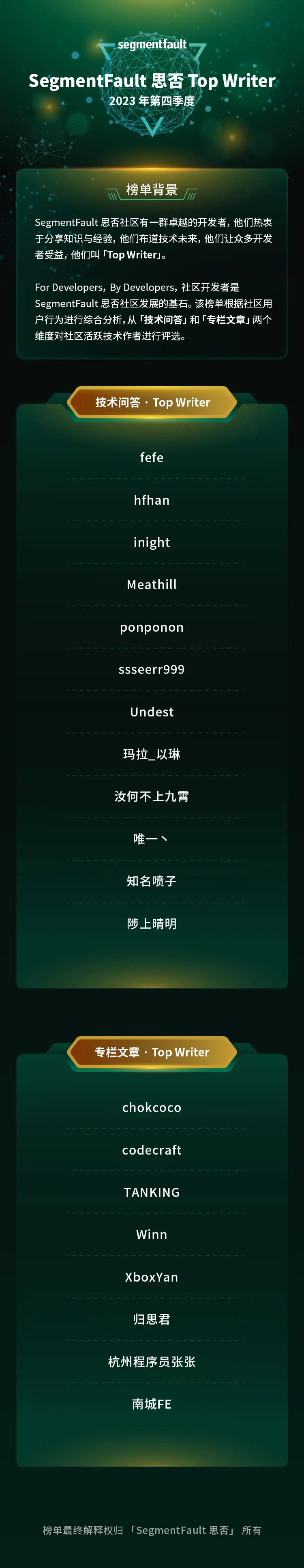 為了感謝 2023 年第四季度中對社區做出卓越貢獻的開發者們,我們基於用户行為大數據(如文章發佈數量、參與回答數量、點贊量等)的綜合分析,從「技術問答」和「博客文章」兩個維度共評選出 20 位創作者給予「SegmentFault 思否 Top Writer」 稱號。他們的出色表現,贏得了社區的尊重和讚譽,讓我們為他們喝彩!他們是: