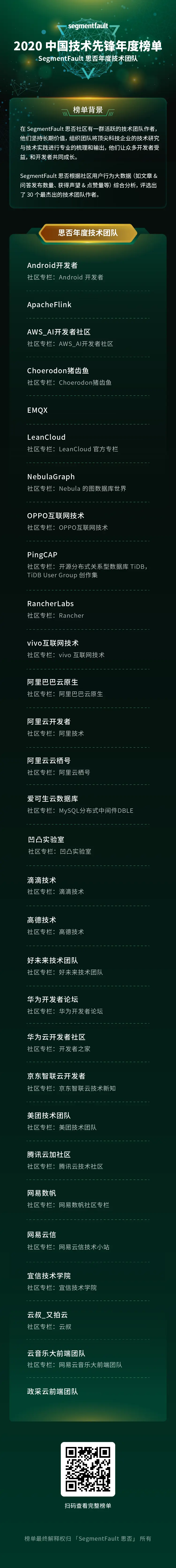 SegmentFault 思否作為中國領先的新一代開發者社區,在 2020 展開了第二屆“中國技術先鋒”年度評選,並先後發佈了《中國技術品牌影響力企業》、《中國開源先鋒 33 人》、《最受開發者歡迎的技術活動》及《SegmentFault 思否 2020 Top Writer》系列榜單。