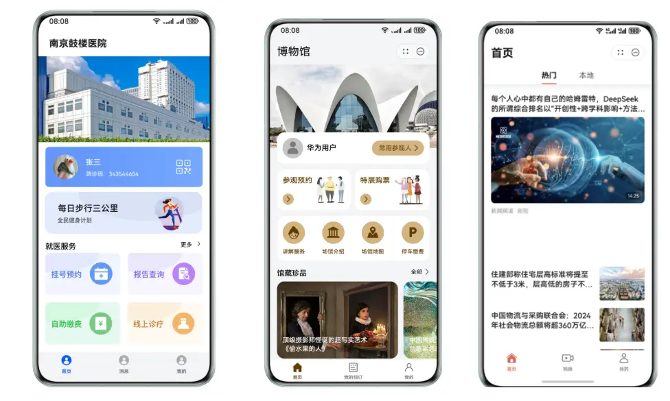 一站式行業解決方案 - 生態市場準備了醫療健康、文娛票務、新聞資訊等場景的HarmonyOS Next模板,助力開發者開發智能醫療應用、快速搭建文化場所票務系統與導覽服務平台以及打造個性化新聞閲讀應用。(下圖分別為:醫療(醫院)元服務模板、娛樂票務(博物館)元服務模板、新聞資訊元服務模板)