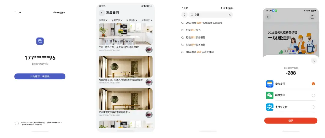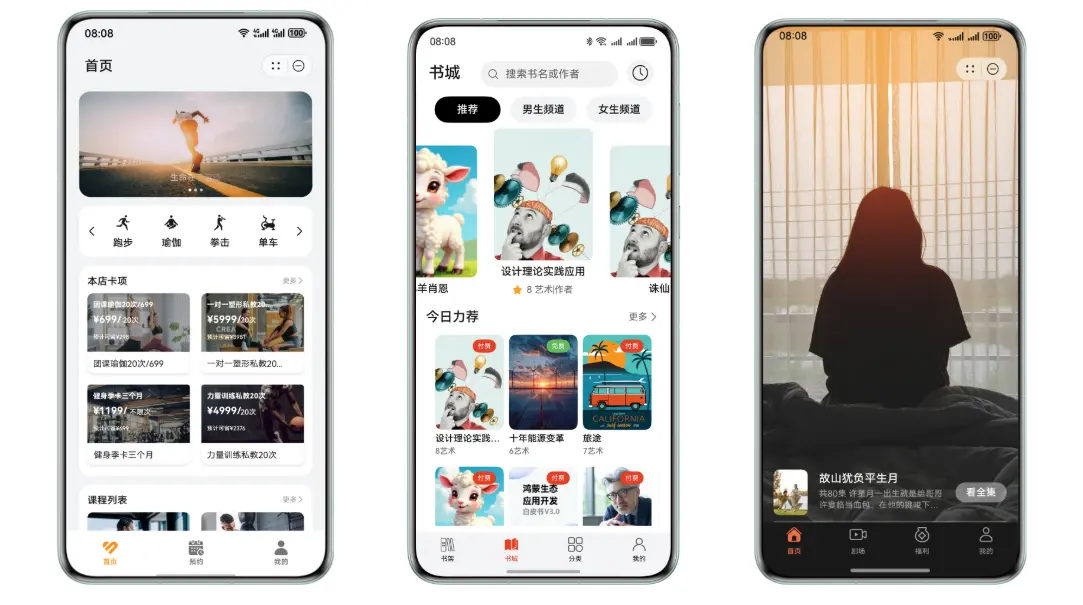 數字內容解決方案開發利器 - 生態市場提供了運動健康、閲讀聽書、影視直播等領域的HarmonyOS Next開發模板,幫助大家實現智能健身方案、構建電子書與有聲讀物平台以及開發短視頻播放應用。(下圖分別為:健身房元服務模板、閲讀聽書模板、網絡短劇元服務模板)