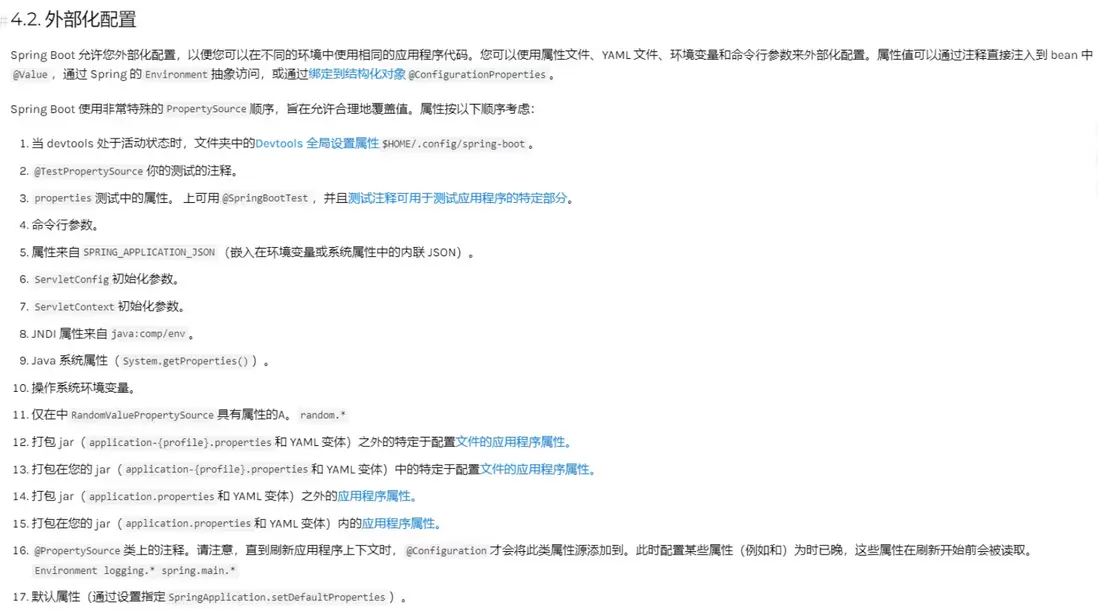 Spring Boot 在啓動時加載配置屬性的完整優先級順序可參考如下的官方文檔:從上到下,優先級逐漸降低,即下面的配置,同樣的參數會被上面的配置所覆蓋