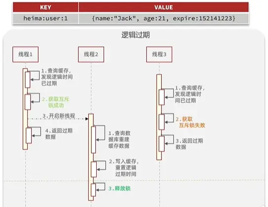 3. 邏輯過期:熱點數據不設置過期時間,後台異步更新緩存,適用於不嚴格要求緩存一致性的場景。