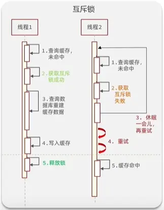 2. 使用互斥鎖(Mutex Key):當緩存不可用時,僅持鎖的線程負責從數據庫中查詢數據並寫入緩存中,其餘請求重試時先嚐試從緩存中獲取數據,避免所有的併發請求全部同時打到數據庫上。步驟如下: