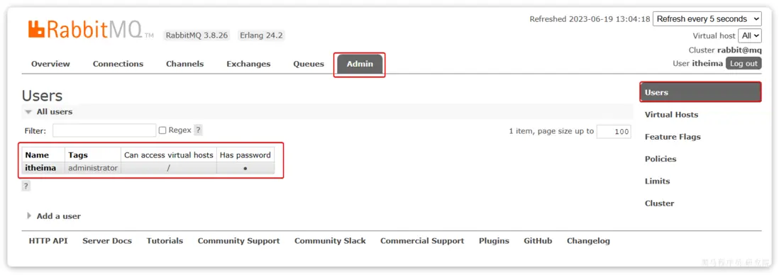 這裏的用户都是RabbitMQ的管理或運維人員。目前只有安裝RabbitMQ時添加的itheima這個用户。仔細觀察用户表格中的字段,如下: