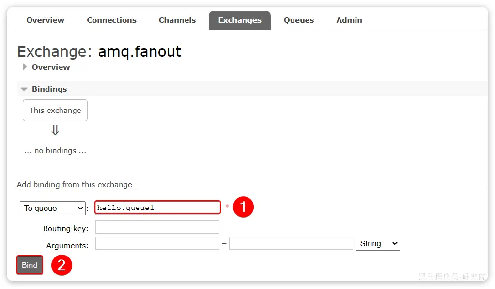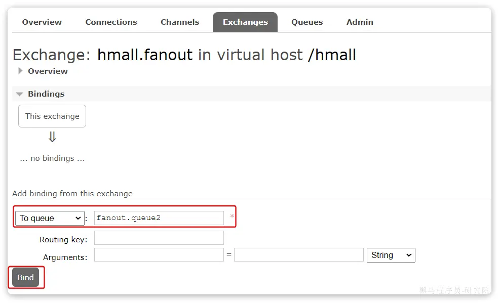 點擊Exchanges選項卡,點擊amq.fanout交換機,進入交換機詳情頁,然後點擊Bindings菜單,在表單中填寫要綁定的隊列名稱: